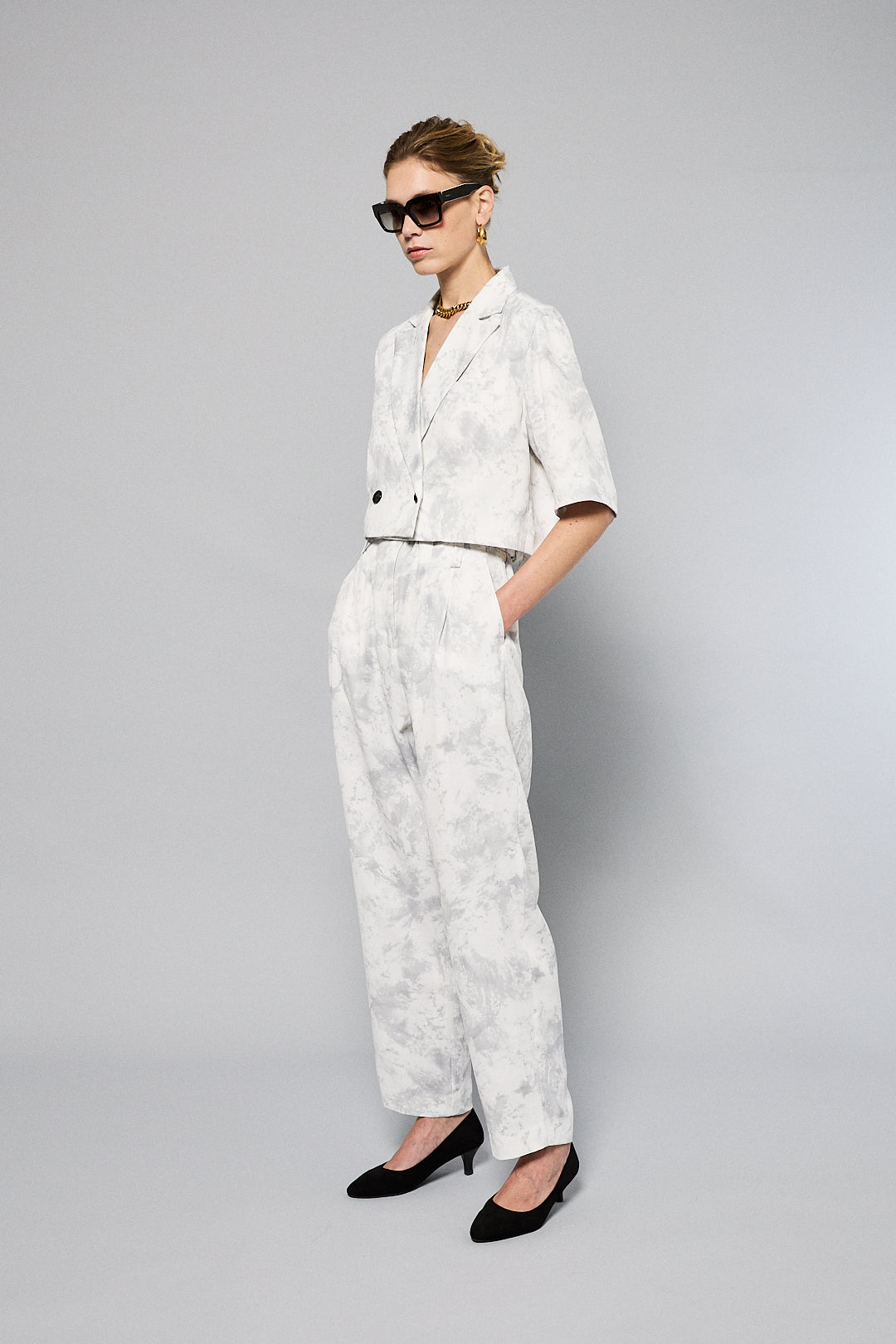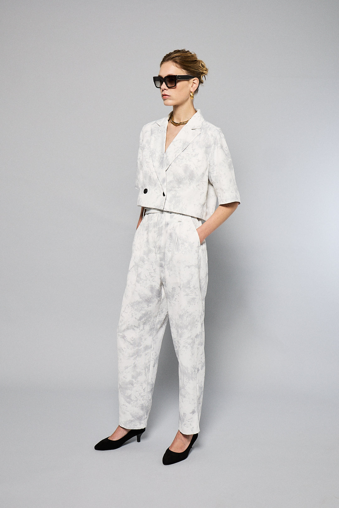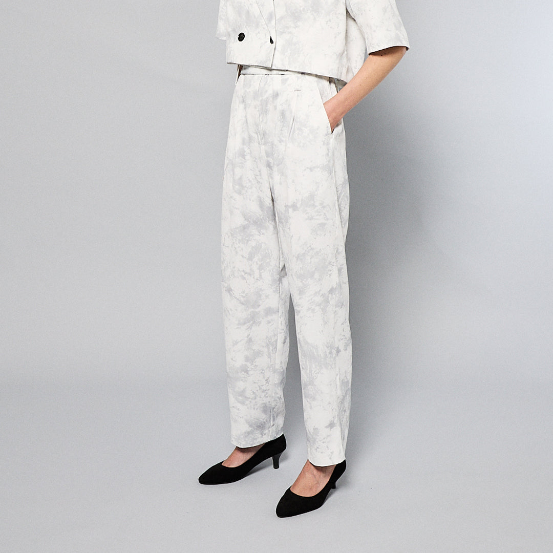 オリジナルマーブルプリントのハイウエストのパンツです。別売のイェレナジャケットと合わせてセットアップで着用できます。前ウエストは小さなプリーツがあり、後ろウエストはゴム仕様でDリングベルトバックルでゆっとり目のフィットでウエスト調整可能です。