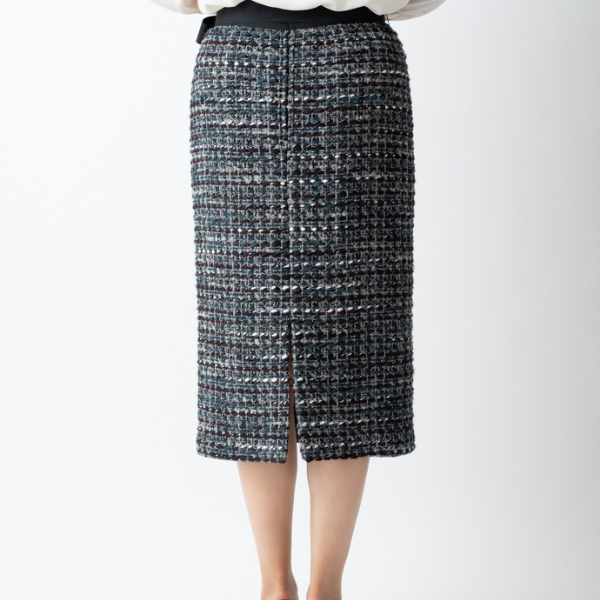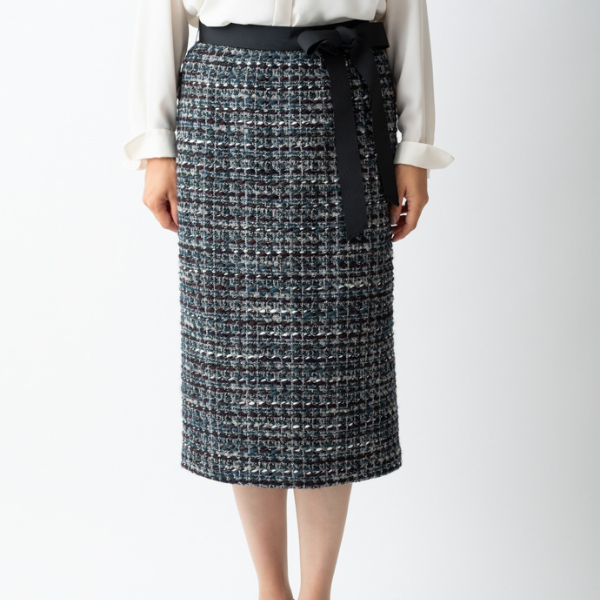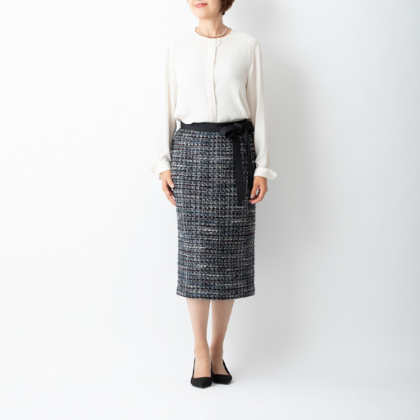ボトムスは、ウエストにあしらったブラックのグログランリボンが華やかさを添えるタイトスカート。デニムジャケットなどを合わせてカジュアルにもエレガントにも着こなしていただけます。