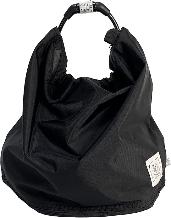 【使い方】 (1)ヘルメットをビクルに入れます。(2)筒状部にワイヤーロックを通します。(3)ファスナーのタブをファスナーガレージを抜けワイヤーロックに通します。(4)自転車のカゴなどにワイヤーロックを通します。