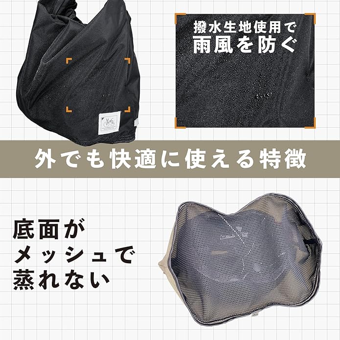 【撥水・防水】撥水生地を使用しており、雨が降ってもヘルメットが濡れるのを防ぎます。さらに、底部分のメッシュで汗や雨で濡れたヘルメットがバッグの中で蒸れにくい構造です。