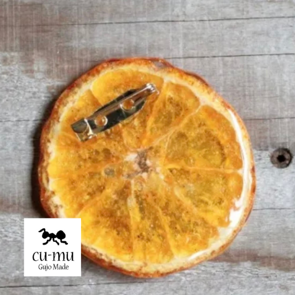 今にも果汁があふれそうなジューシーな本物のオレンジをそのまま閉じ込めてブローチにしました。