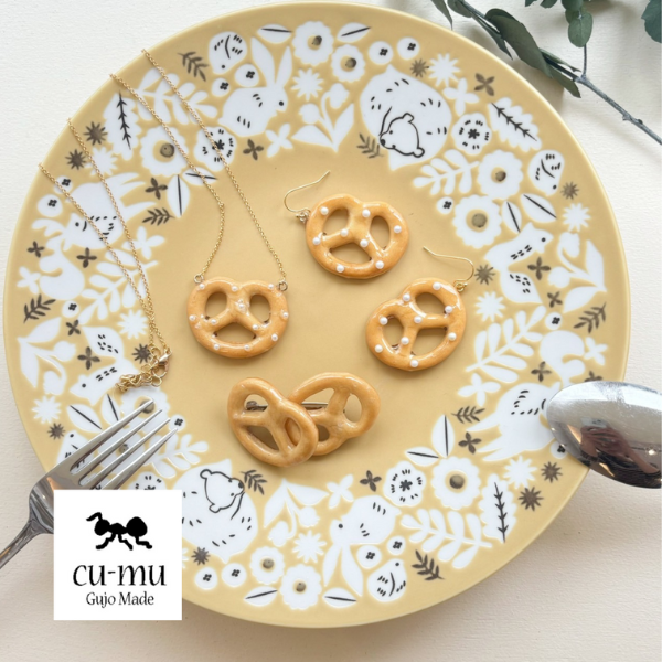 香ばしい香りが漂ってきそうな本物のプレッツェルを小粒パールでおめかししてピアスにしました。