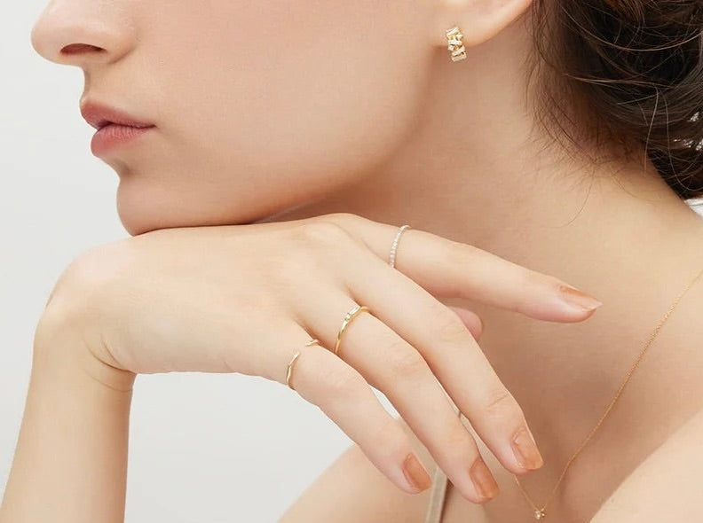 シャープさと柔らかさをミックスし、結晶のような輝きを詰め込んだピアスです。長方形のバケットカットダイヤモンドをランダムに角度をつけて間にラウンドダイヤモンドを挟み込んだ耳たぶに巻き付くようなデザインです。