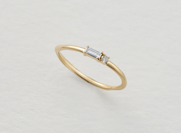 リングの線に沿うような長方形のバケットカットダイヤモンドとラウンドのダイヤモンドを組み合わせることで、さりげない拘りをデザインにしました。歪でかっちりし過ぎないリングです。
