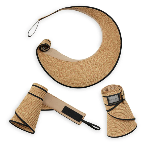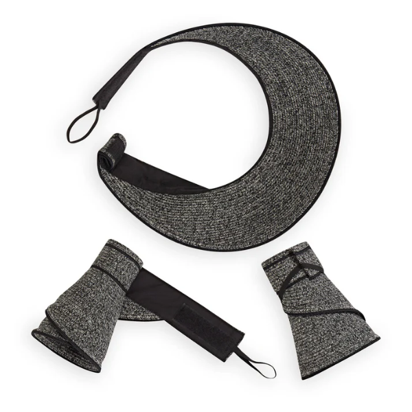 太陽の光をカットするのに最適なツバ広バイザー。小さく丸めることができるため、バックに入れておくと便利です。